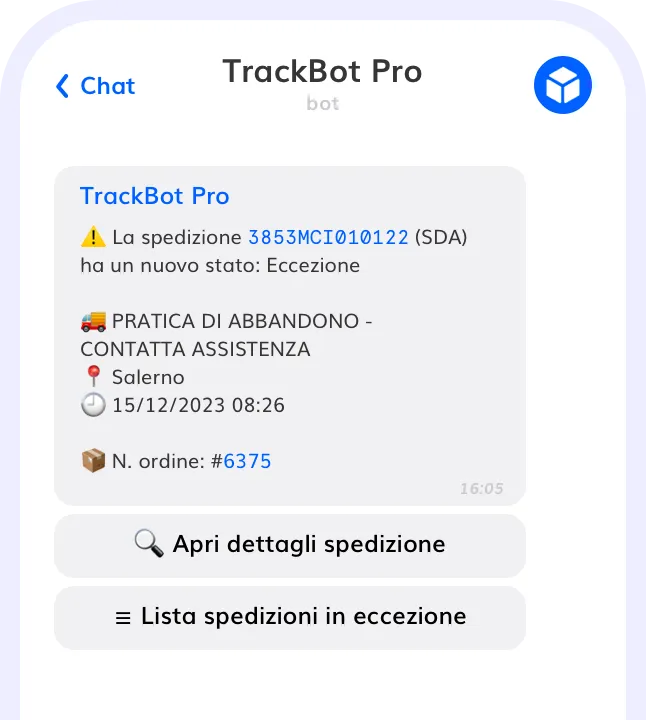 Collega il bot Telegram di TrackBot Pro e ricevi avvisi quando le spedizioni vanno in eccezione, in modo da poter intervenire tempestivamente.